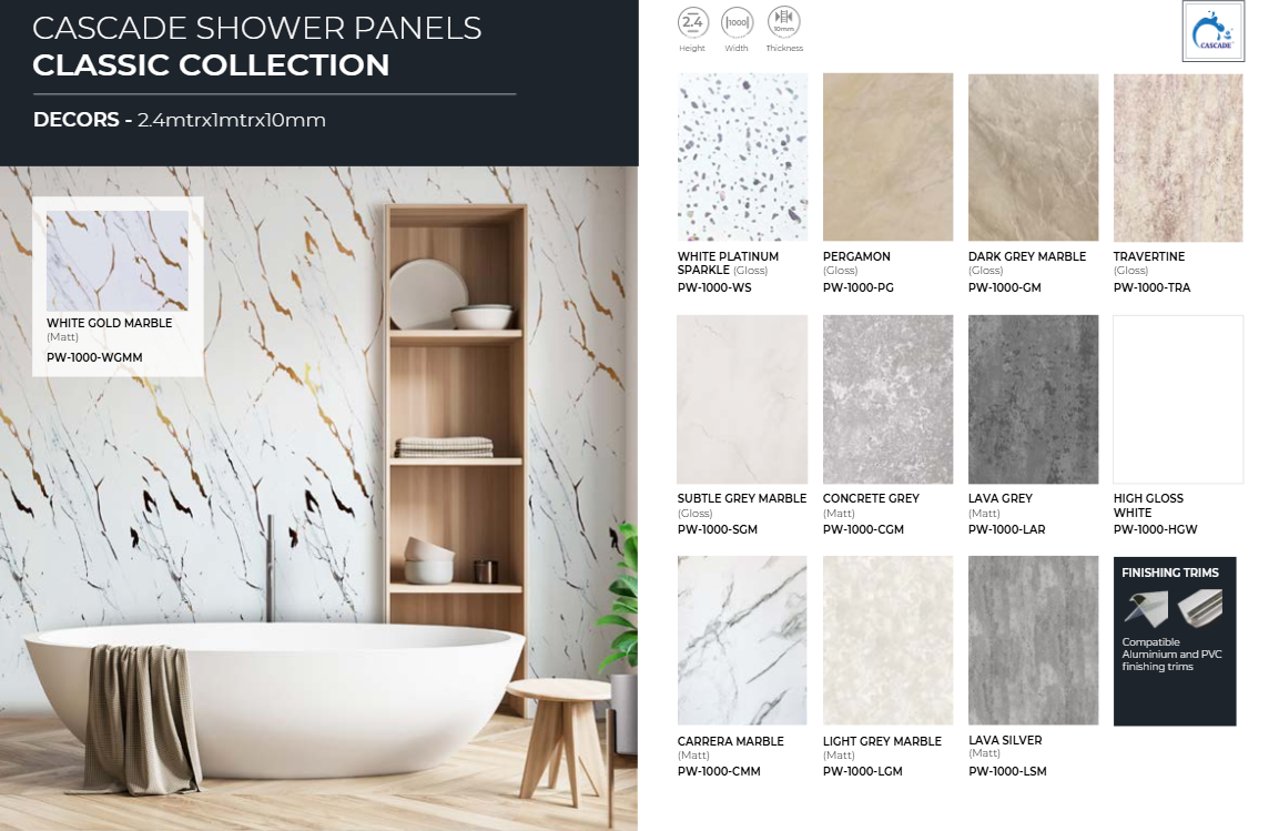 uPVC shower panels are prefabricated waterproof wall systems designed for bathrooms and shower enclosures. They provide a seamless, grout-free finish that protects your walls from moisture while transforming the look of your space.